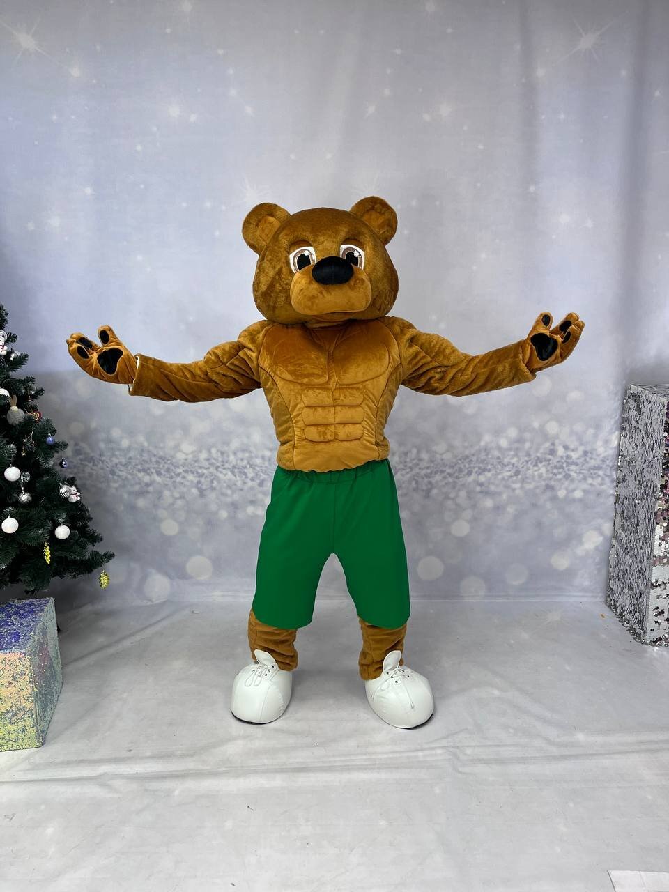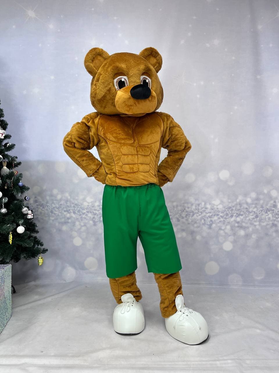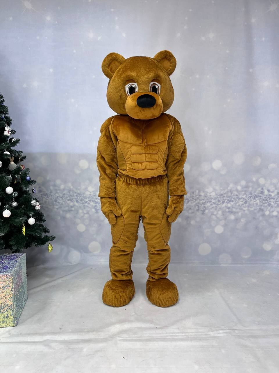Комплектация медведя: голова, кофта с имитацией мышц, штаны с имитацией мышц, перчатки, обувь из кож. зама., чехлы на обувь, наряд Комплектация белки: голова, тело-комбинезон с хвостом, перчатки, обувь из кож.зама.